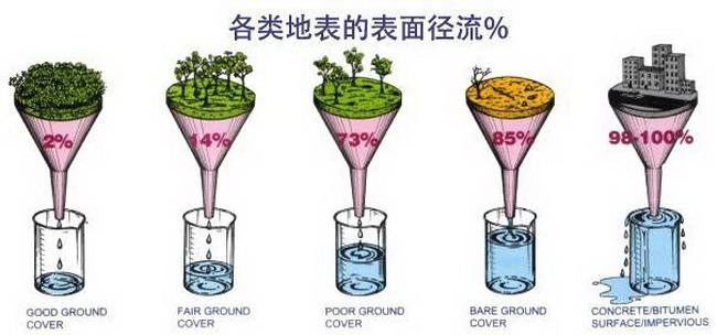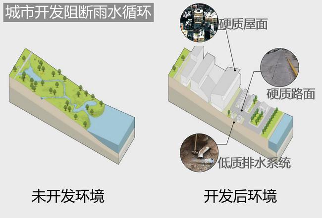 2015年5、6月份,在广东大范围的强降雨使包括广州、深圳在内的多数城市遭受内涝,而仅仅是一次的降雨事件,受影响城市便出现了道路中断、交通瘫痪、房屋被淹、民众受困等严重灾情,受灾人口42.41万人,直接经济损失5亿元。 2015年6月16日至17日凌晨,上海暴雨预警升级成橙色,部分地区降雨量突破200毫米。 降水导致上海多个地方出现积水,近百条马路积水达膝盖,公交车行困难,大批小车抛锚,众多老房渗漏,不少路段拥堵处瘫痪,上班族经受重大考验。 而近年,在湖北、湖南、广西、江西等多数城市也都因降雨产生的内涝蒙受了巨大损失。事实上,“逢雨必涝,城市看海”是我国绝大部分的城市都长期面临着的问题。 在原始自然的条件下,大部分的雨水由地面吸收并渗入地下,然后由地表和植物表面被蒸发,回到大气中,多余的雨水从地表缓慢地汇集于溪流江河,排入湖泊海洋。 但是,城市的开发建设改变了这种自然循环,由于不透水屋面和地面随着城市化的进程而持续不断地快速增加,能够吸收雨水的地面和水面急剧减少,地下水的渗入更是匮乏,从而导致地表径流的不断增加,加大内涝威胁。 无法流入土地的雨水在地面汇集形成径流排入市政排水系统,但地表径流的增加,意味着更多原本清洁的雨水经城市地表的污染物所污染,并且排水管道的压力也随之增加。 同时因为城市排水管道为硬质设施,难以配合多变的降雨而变化排量,所以会出现排水不足而产生内涝的情况。尤其在我国前期建设不够规范的情况下,城市所依赖的管道排水系统其实已不堪重负,因此内涝频繁发生。